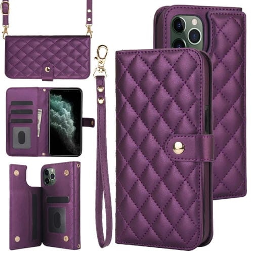 Funda para Teléfono iPhone 11 Pro Crossbody de Cuero Rómbico Multifunción (Púrpura Oscuro)