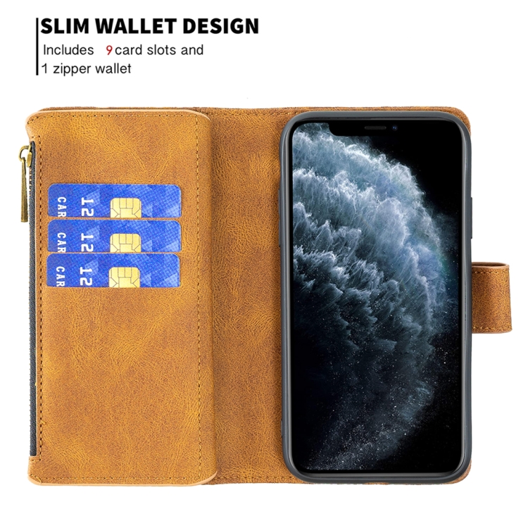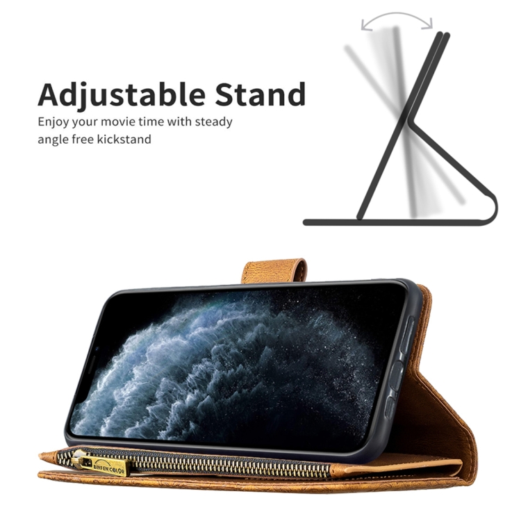 Funda de Cuero para iPhone 11 Pro Flying Butterfly Patrón Relieve Cremallera Horizontal Flip con Soporte y Ranuras para Tarjetas y Billetera (Marrón)
