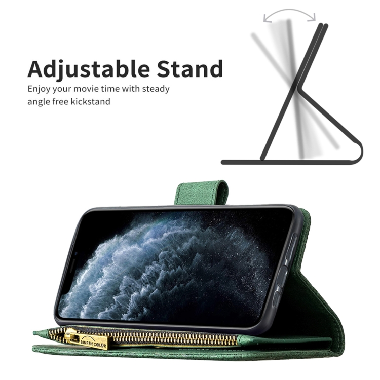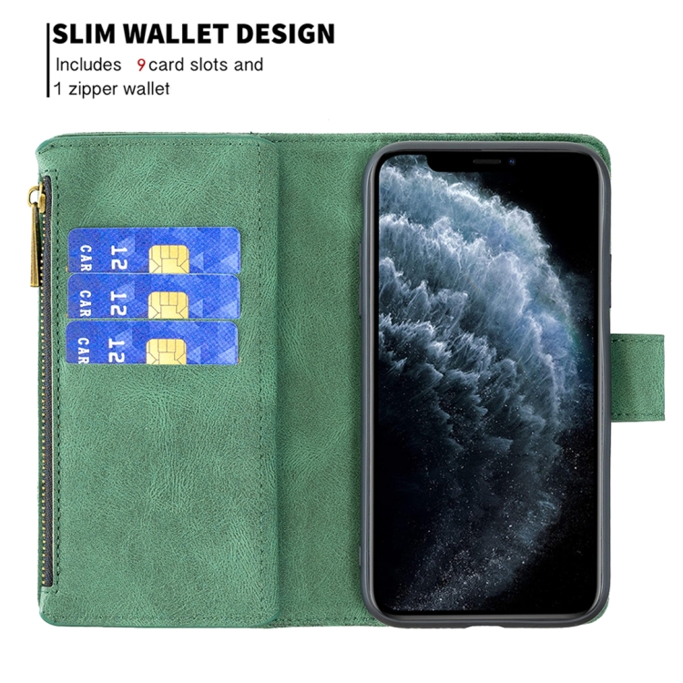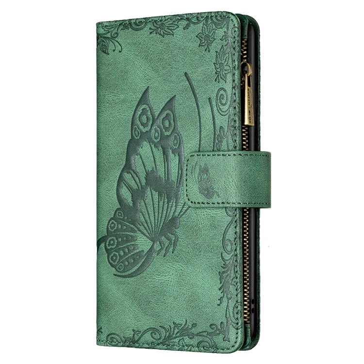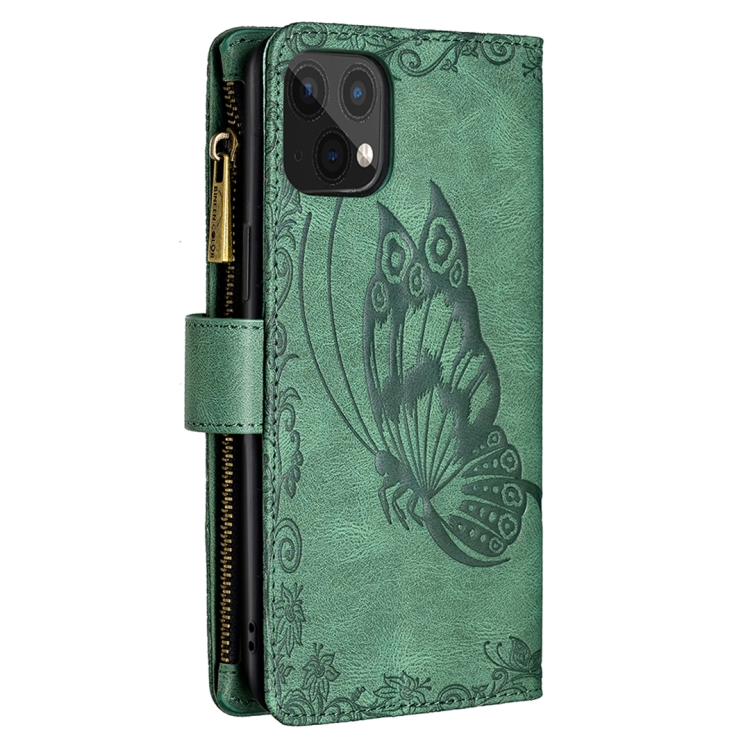 Funda para iPhone 11 Pro Flying Butterfly Relieve Patrón Cremallera Horizontal Flip Cuero con Soporte y Ranuras para Tarjetas y Billetera (Verde)