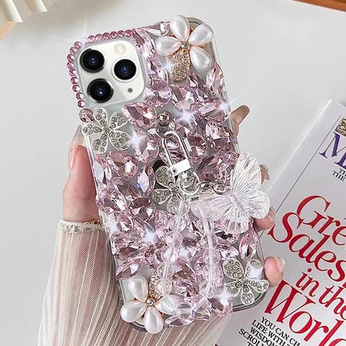 Funda para Teléfono iPhone 11 Pro con Incrustaciones de Diamantes y Mariposas Hecha a Mano (Rosa)