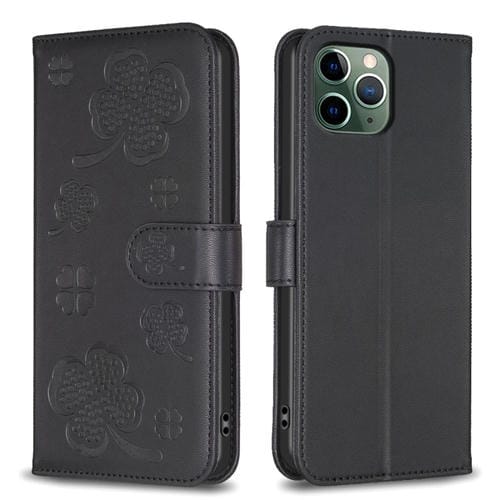 Funda para Teléfono iPhone 11 Pro Cuero con Relieve de Cuatro Hojas (Negro)