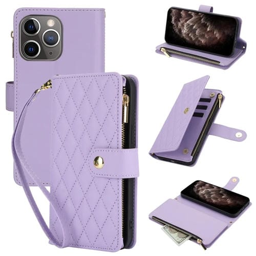 Funda de Cuero Ym016 para iPhone 11 Pro Max con Billetera, Tarjeta, Cremallera Rómbica y Cordón (Púrpura Claro)