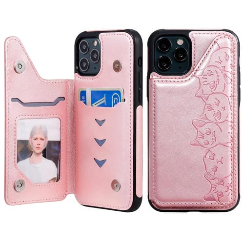 Estuche protector para iPhone 11 Pro Six Cats con patrón de relieve, soporte, ranuras para tarjetas y marco de fotos (Oro Rosa)