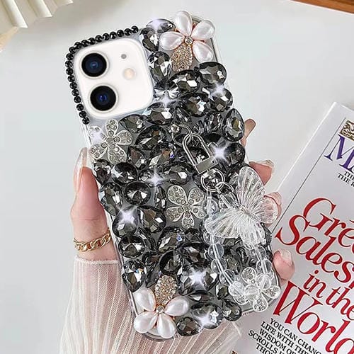 Funda para Teléfono iPhone 12 con Incrustaciones de Diamantes y Mariposas Hecha a Mano (Negro)