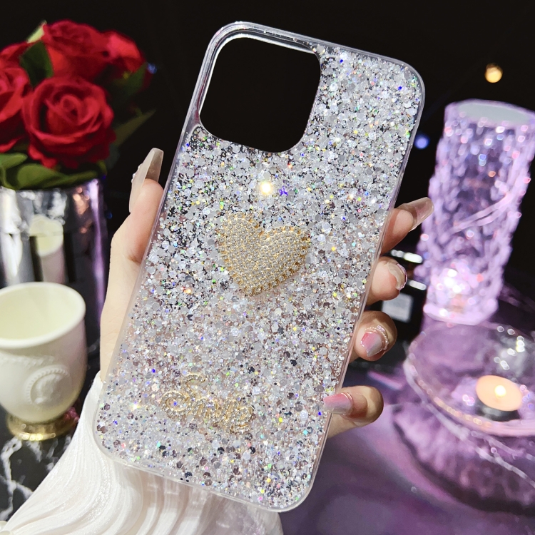 Funda para Teléfono TPU Epoxi para iPhone 12 con Corazón de Diamante y Lentejuelas Estrelladas (Plateado)