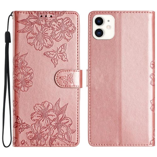 Funda para Teléfono iPhone 12 Mini PU Sensación de Piel Mariposa y Flor de Cerezo (Oro Rosa)