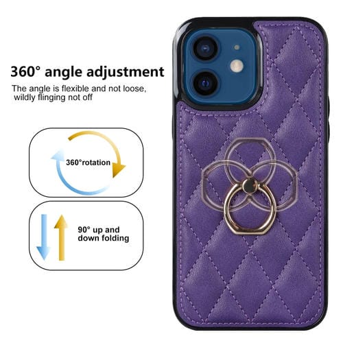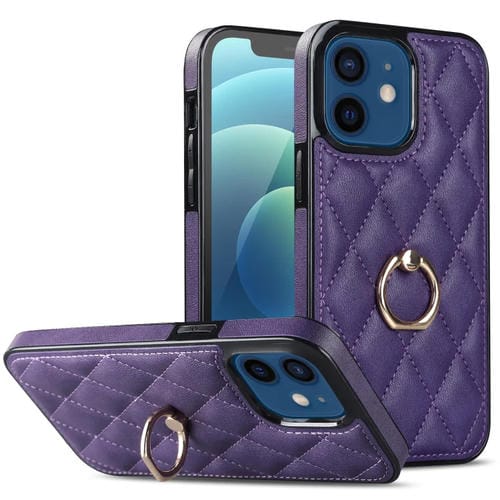 Funda de Cuero Rhombic para iPhone 12 Mini con Soporte para Anillo (Púrpura)