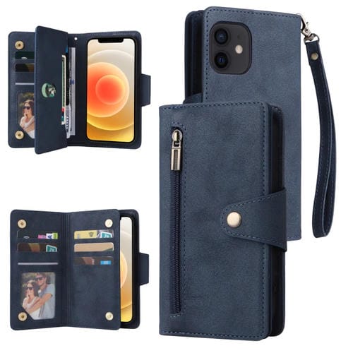 Funda de Cuero para iPhone 12 Mini Rivet Buckle Tres Pliegues 9 Cards (Azul)