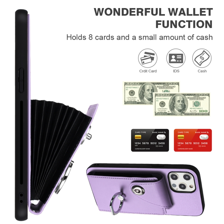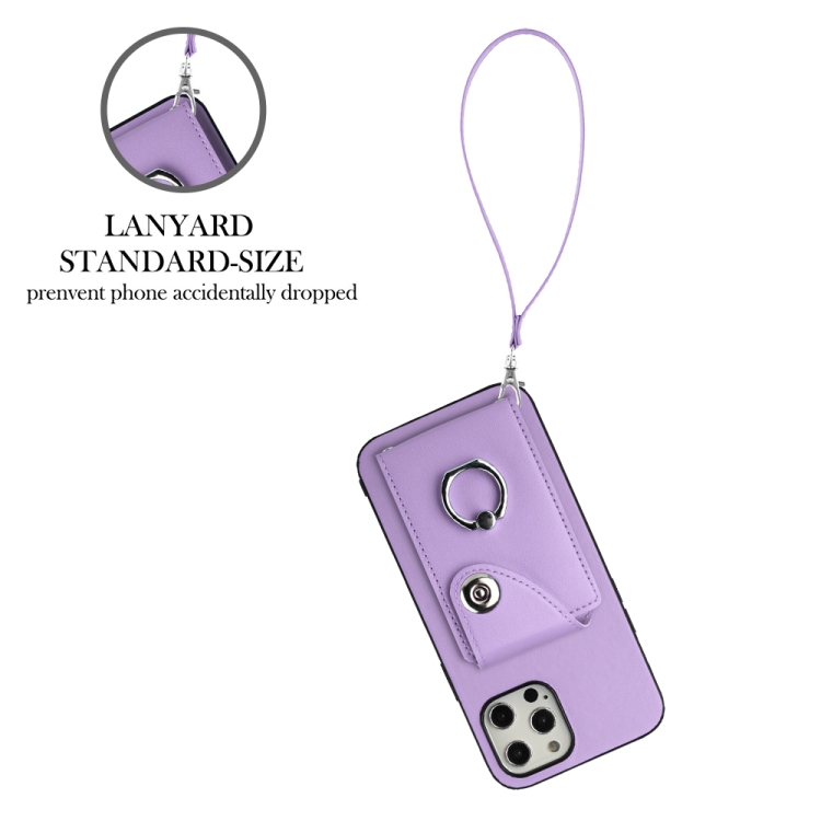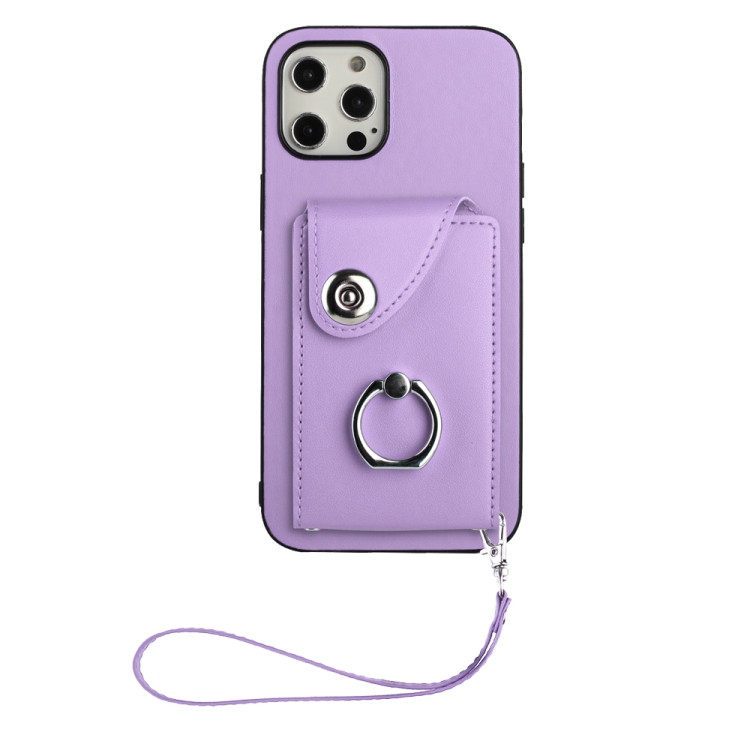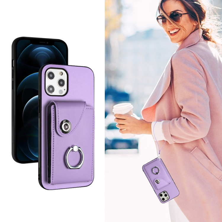 Funda para Teléfono iPhone 12 Pro de PU con Soporte para Anillo y Bolsa para Tarjeta con Cordón (Púrpura)