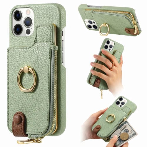 Funda Trasera para iPhone 12 Pro con Billetera, Cremallera y Anillo de Cuero Litchi (Verde Té)