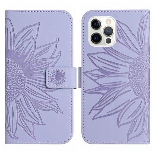 Funda Flip de Cuero para iPhone 12 Pro Max Skin Feel Sun Flower Pattern con Cordón (Púrpura)