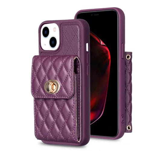 Caja de Teléfono de Cuero Rómbica Billetera con Hebilla Metal Vertical para iPhone 13 (Púrpura Oscuro)