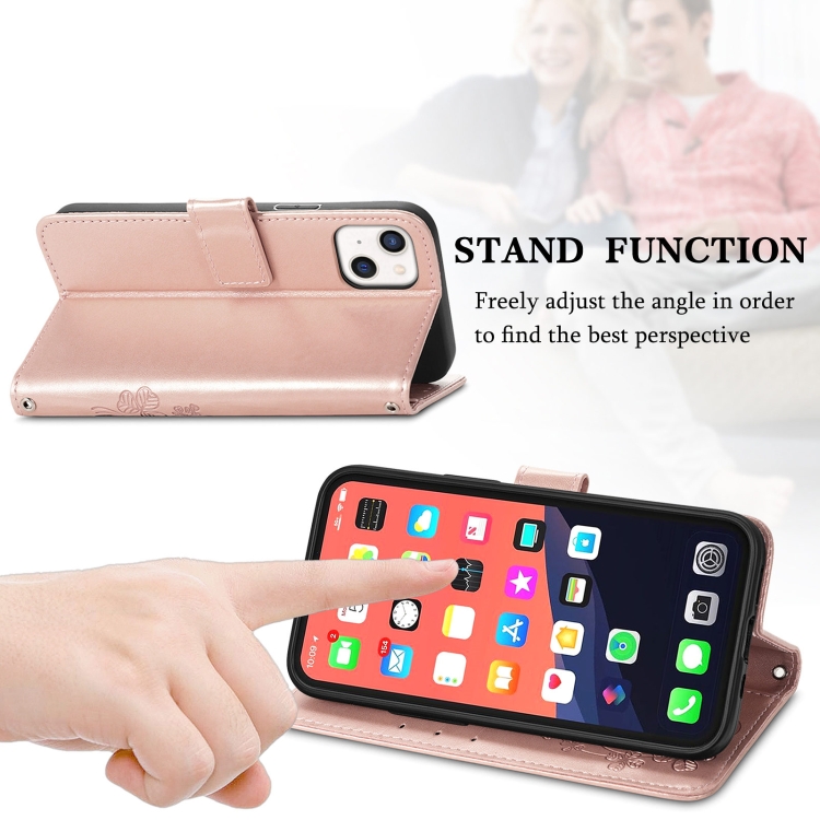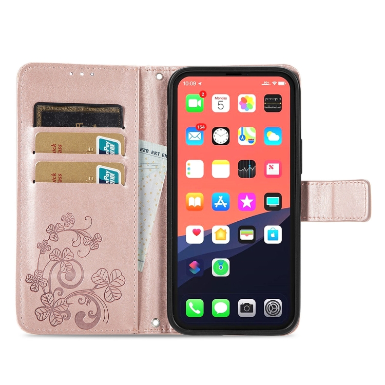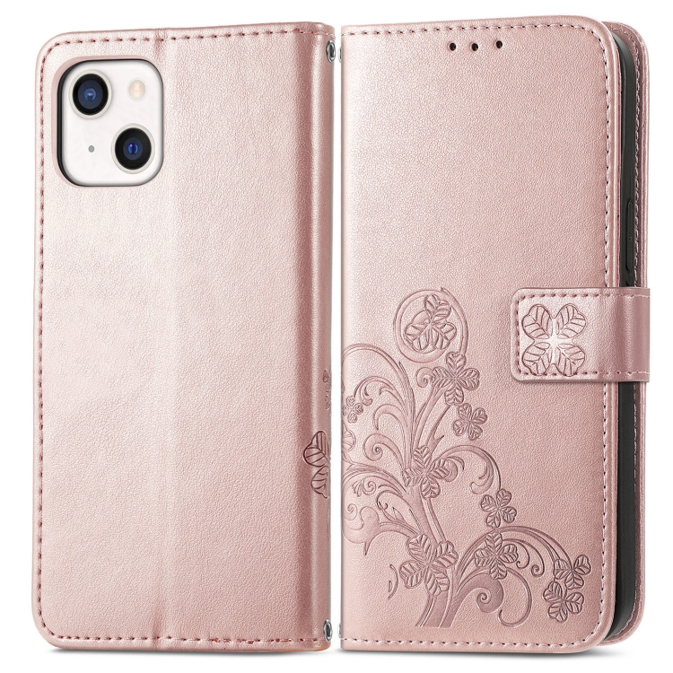 Funda de Cuero para iPhone 13 con Cierre de Trébol y Hebilla, Ranura para Tarjeta, Billetera y Soporte (Oro Rosa)