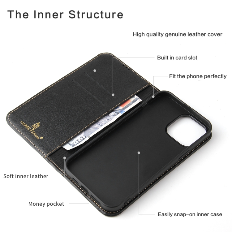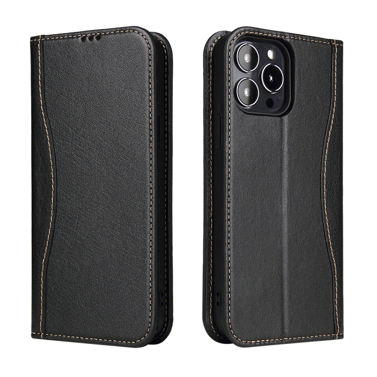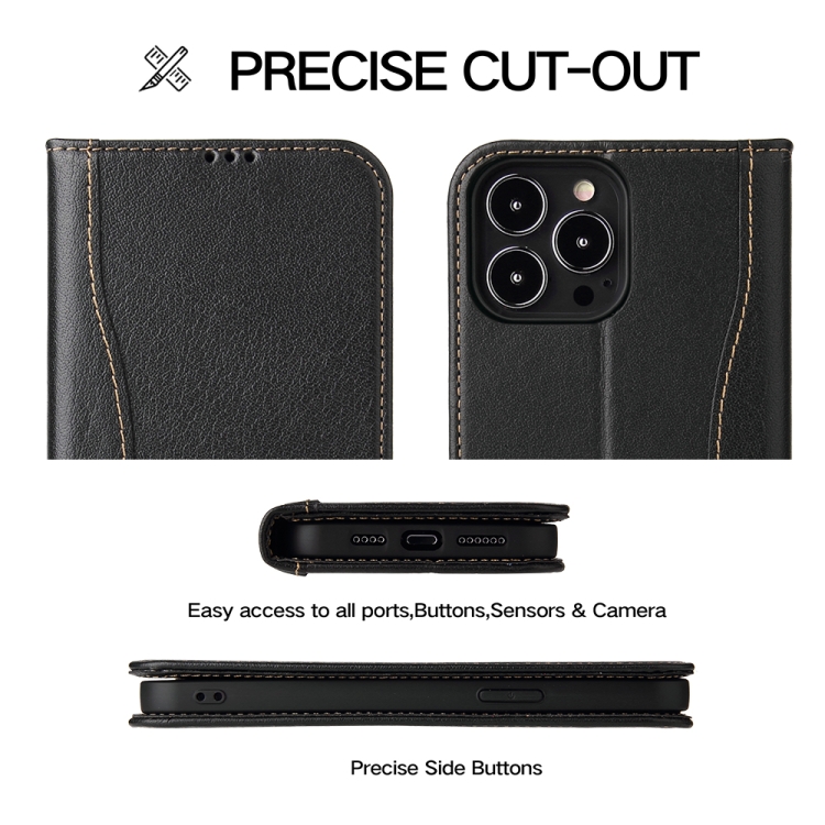 Funda para iPhone 13 Cuero Genuino con Tapa Horizontal Soporte Ranuras para Tarjetas y Billetera (Negro)