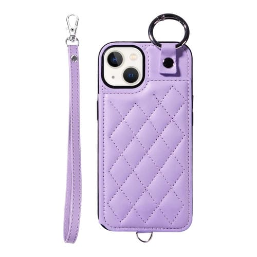 Funda para Teléfono iPhone 13 con Bolsa para Tarjetas Textura Rómbica y Cordón Corto (Púrpura)