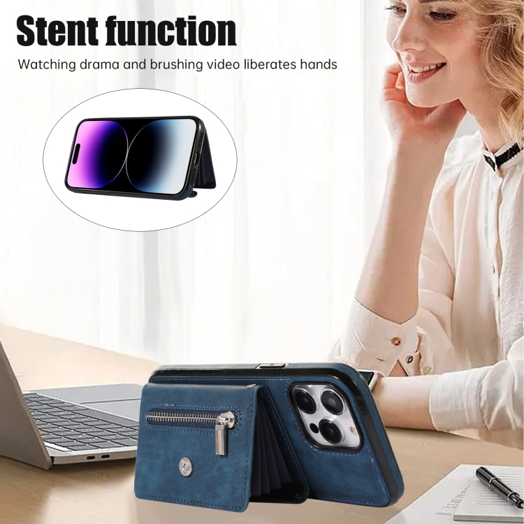 Estuche para Teléfono iPhone 13 Pro con Cremallera Rfid y Ranura para Tarjeta con Cordón Corto (Azul)