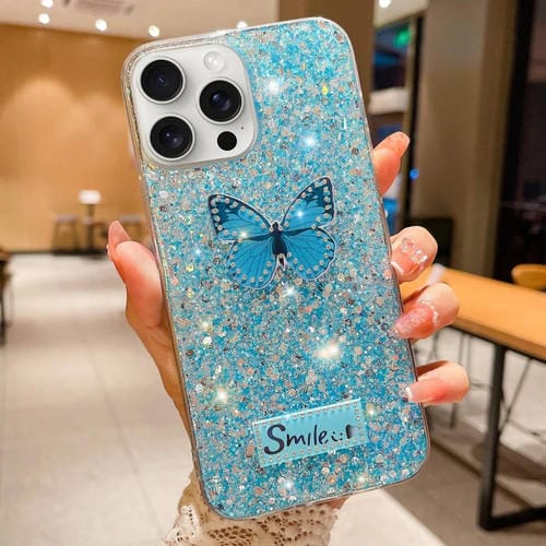 Funda para Teléfono iPhone 13 Pro Max Epoxy TPU con Lentejuelas Rhinestones Mariposa (Azul)