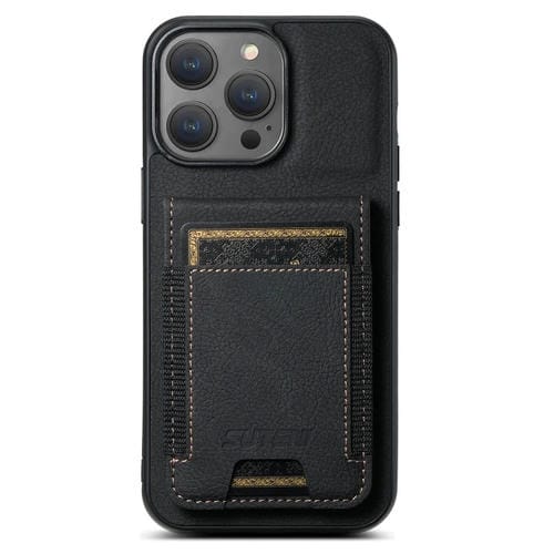 Funda para Teléfono Suteni H03 para iPhone 13 Pro Max con Soporte para Tarjeta de Cuero Litchi (Negro)