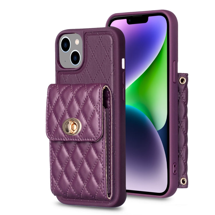 Caja de Teléfono de Cuero Rómbica para iPhone 14 Billetera con Hebilla de Metal Vertical (Púrpura Oscuro)