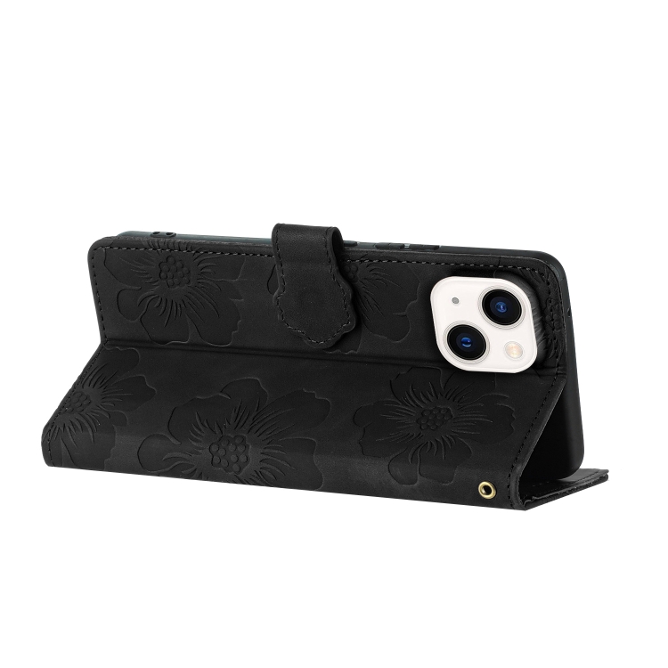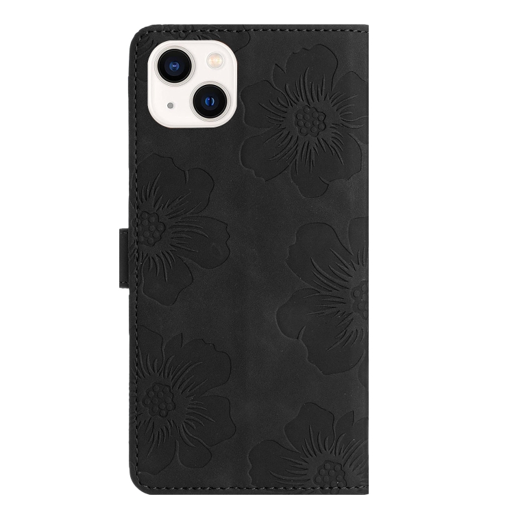 Funda de Teléfono iPhone 14 Cuero Estampado de Flores en Relieve (Negro)