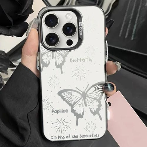 Caja de Teléfono Híbrida TPU PC para iPhone 14 Pro Max con Pintura Plateada (Mariposa Hueca Negra)