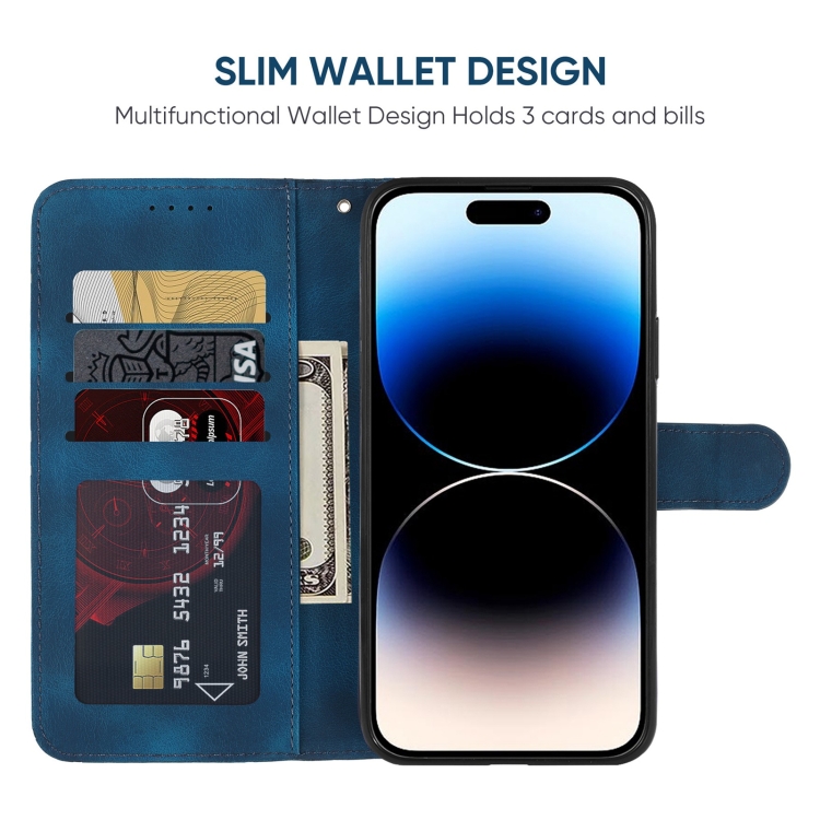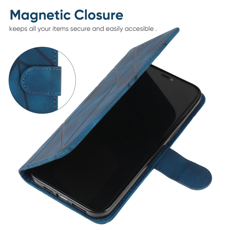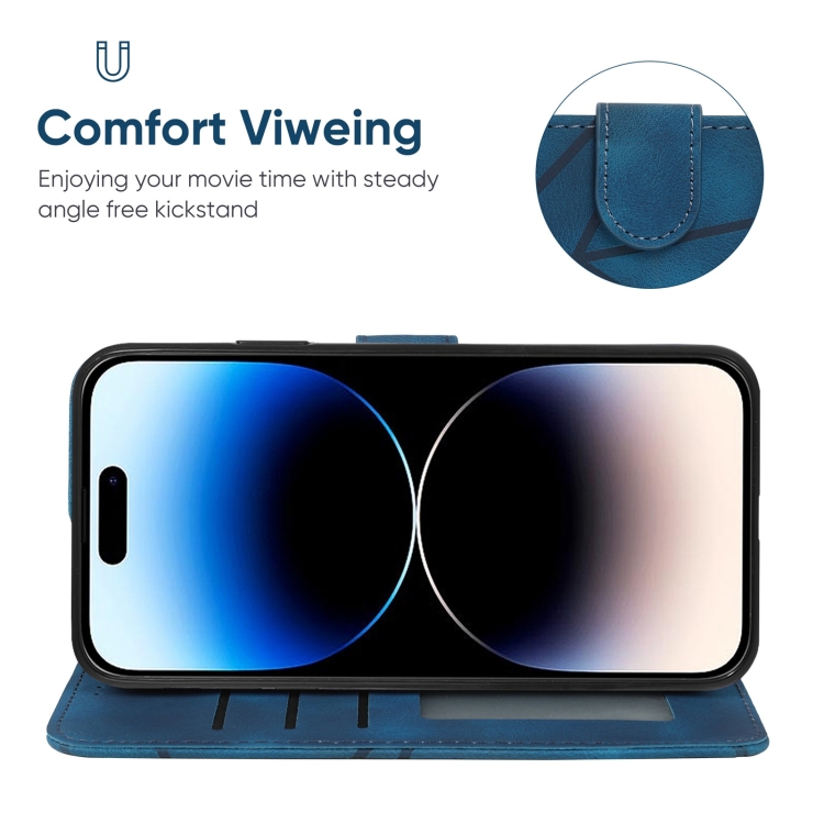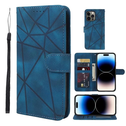 Funda para teléfono iPhone 14 Pro Skin Feel de cuero con líneas geométricas (Azul)