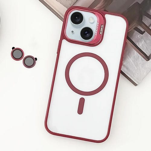 Estuche para Teléfono iPhone 15 TPU Híbrido Acrílico Magsafe con Soporte y Película para Lentes (Rojo)