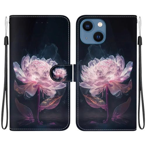 Funda de Cuero para iPhone 15 con Dibujo Coloreado y Textura de Cristal (Peonía Púrpura)
