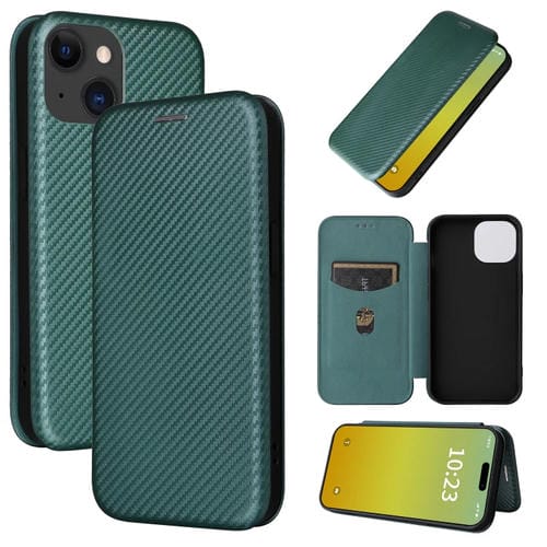 Funda de Teléfono iPhone 15 Tapa de Cuero Textura Fibra de Carbono (Verde)