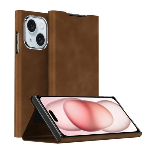 Funda Magnética de Cuero para iPhone 15 con Textura de Napa y Soporte (Marrón)