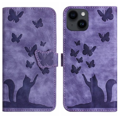 Funda para Teléfono iPhone 15 Cuero con Tapa y Estampado de Gato Mariposa (Púrpura)