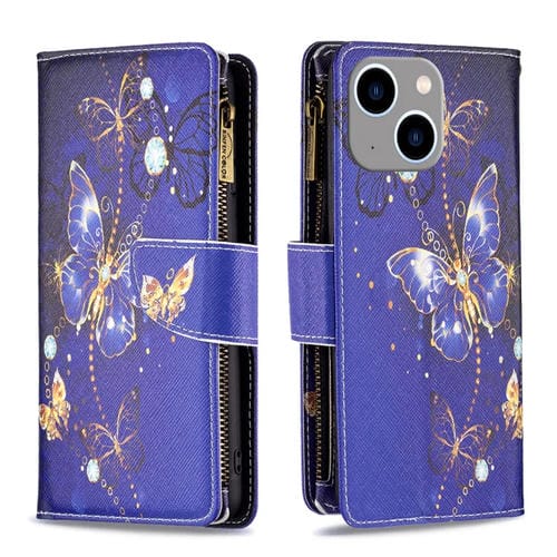 Funda de Cuero para iPhone 15 Plus Patrón de Dibujo Coloreado con Cremallera (Mariposa Púrpura)