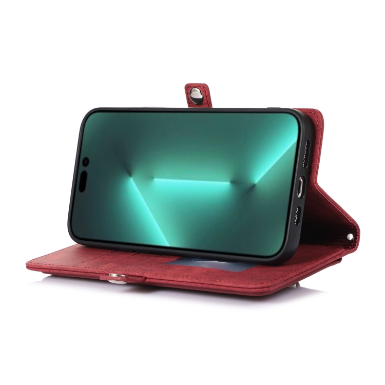 Funda de Cuero para Teléfono iPhone 15 Pro Cremallera Ranura para Tarjeta Hebilla Monedero (Rojo)
