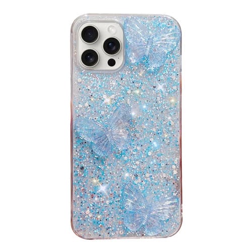 Funda para Teléfono TPU Epoxi iPhone 15 Pro con Mariposas de Cristal y Lentejuelas Estrelladas (Azul)