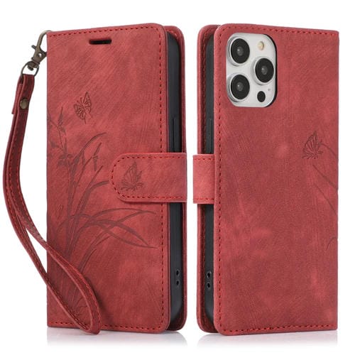 Funda para Teléfono iPhone 15 Pro Max Cuero con Relieve de Mariposa Orquídea (Rojo)