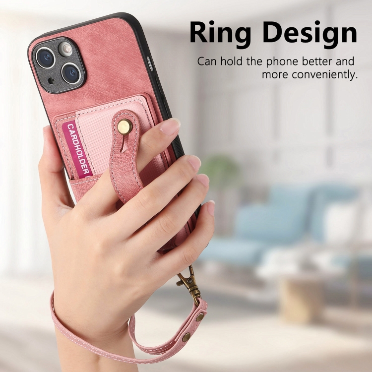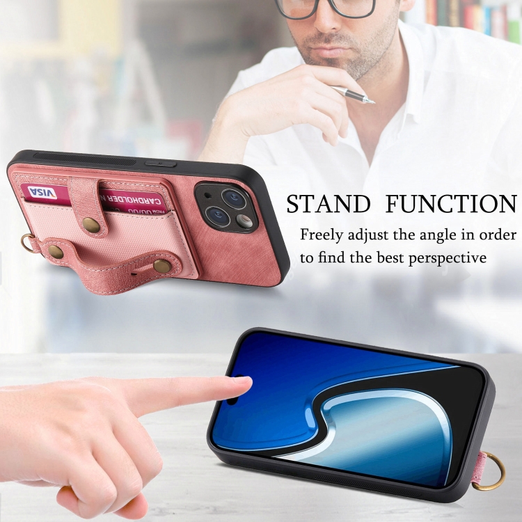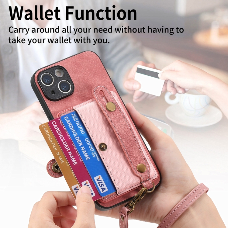 Funda Trasera Para iPhone 15 Retro Cross Muñequera Monedero de Cuero (Rosa)