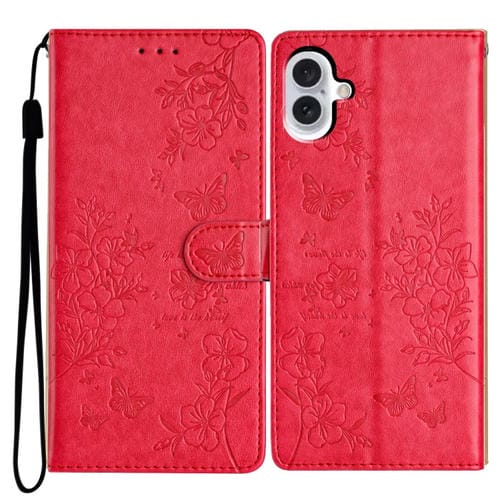 Funda para Teléfono iPhone 16 Plus Cuero Relieve Flor de Amor y Mariposa (Rojo)