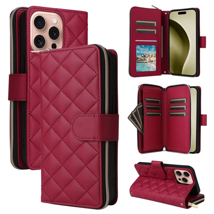 Funda para Teléfono iPhone 16 Pro Cuero Hebilla Torre Cremallera Rombal Cruzada Cordón (Rojo Vino)