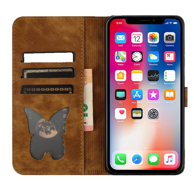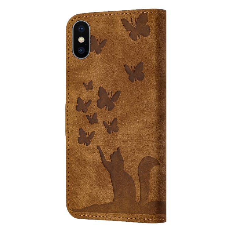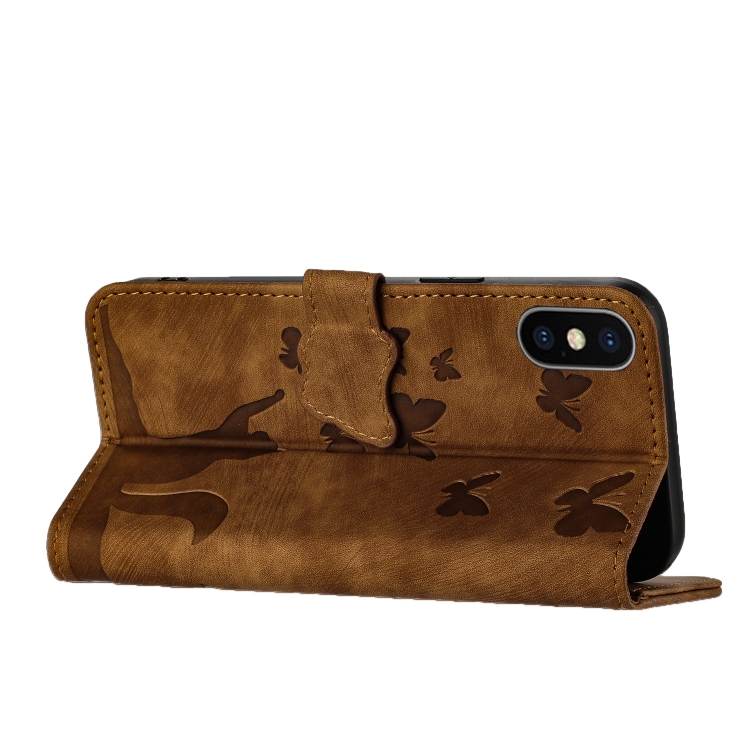 Funda de Cuero para iPhone X / Xs con Tapa y Estampado de Gato Mariposa (Marrón)