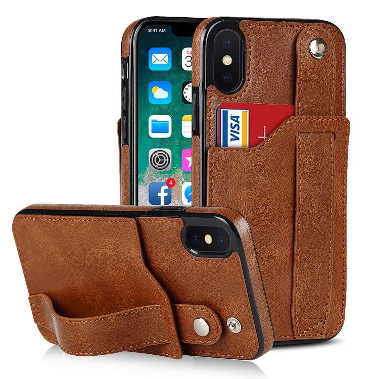 Funda para iPhone Xs Max Crazy Horse Texture Cuero TPU + PU a Prueba de Golpes con Ranura para Tarjeta y Correa para la Muñeca (Marrón)