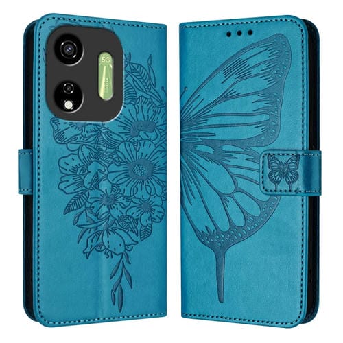 Funda de Cuero para Itel P55 5G con Mariposa en Relieve (Azul)