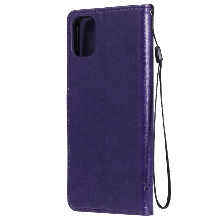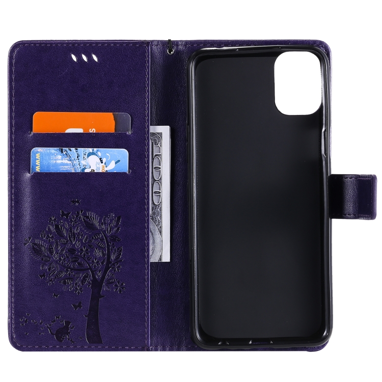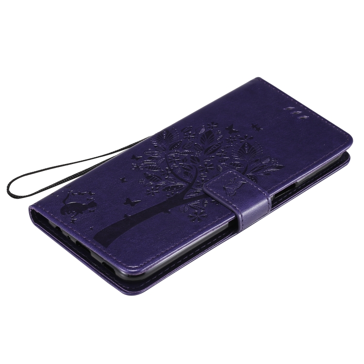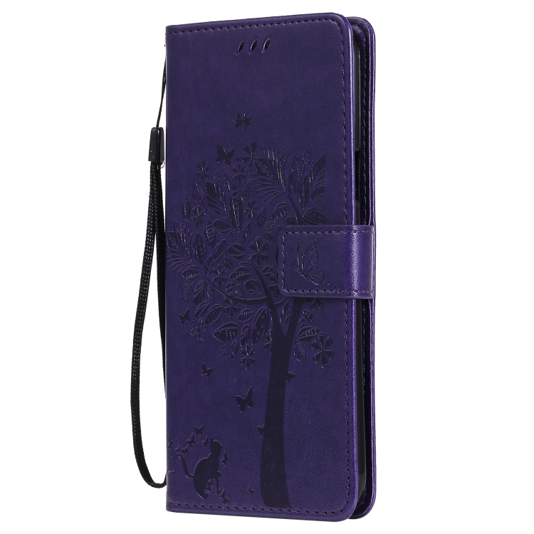 Funda de Cuero PU para LG K42 con Patrón Árbol y Gato, Flip Horizontal, Soporte, Tarjetero y Cordón (Púrpura)