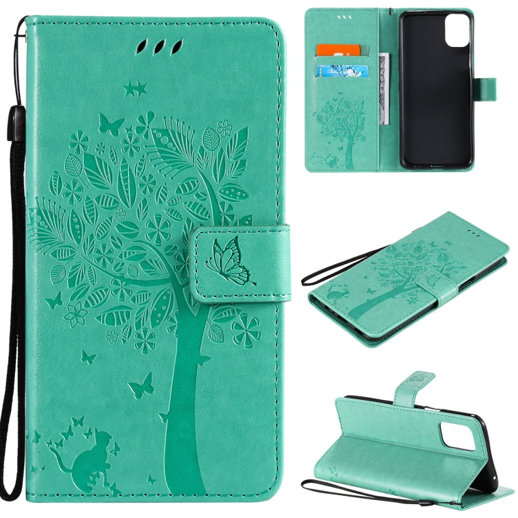 Funda de Cuero PU para LG K42 con Impresión Tree & CAT, Titular, Tragamonedas y Cordón (Verde)