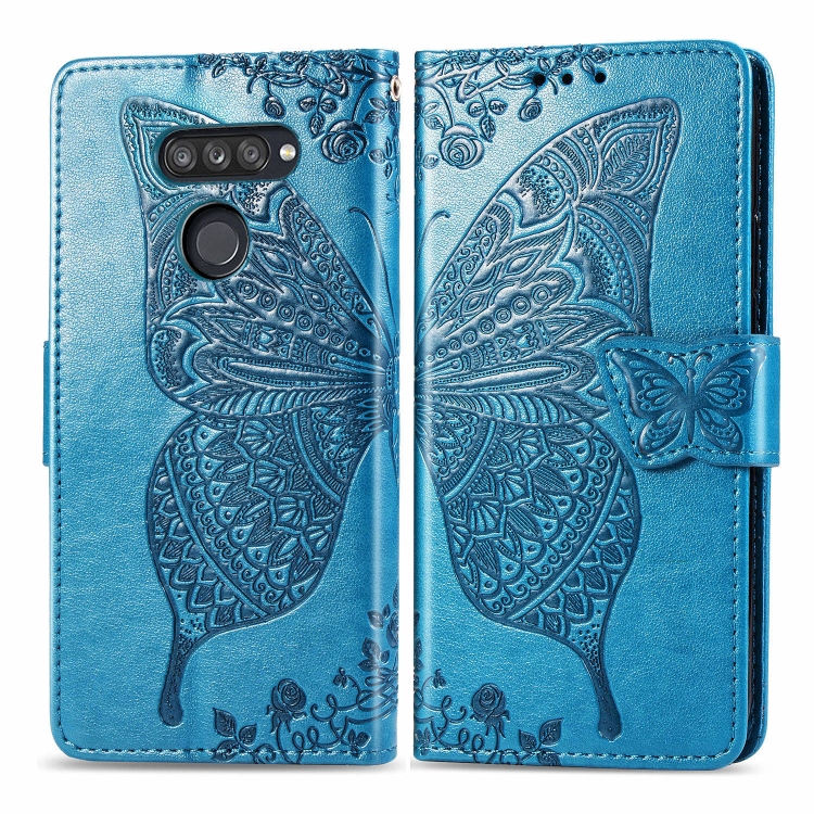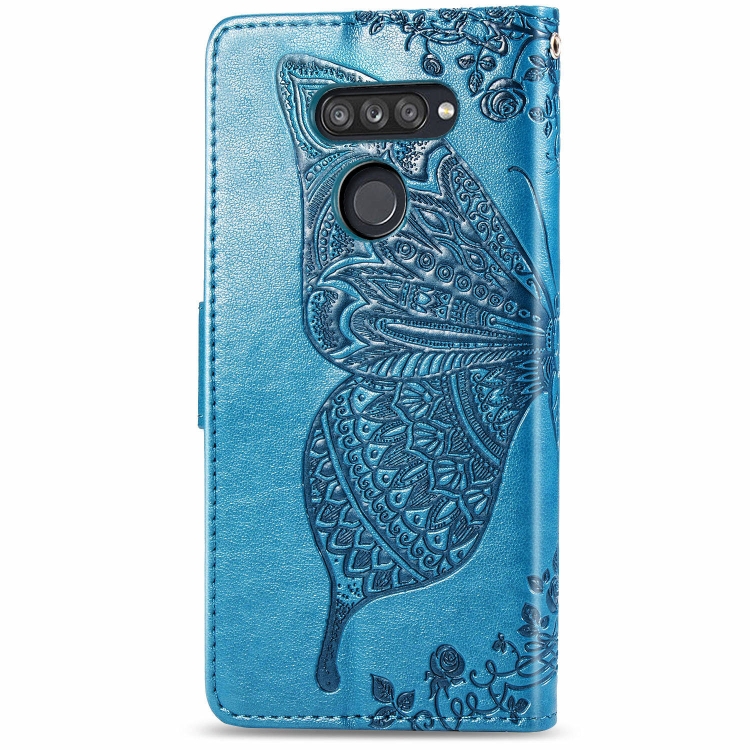 Funda de Cuero para LG K50S Butterfly Love Flower con Tapa Horizontal, Soporte, Ranura para Tarjeta y Cordón (Azul)