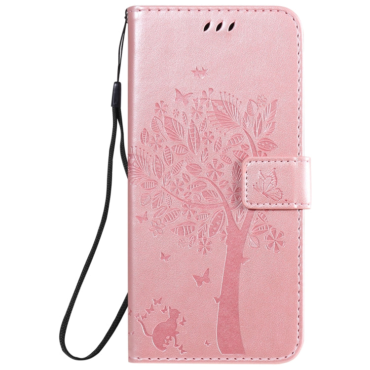 Funda de Cuero para LG K50S con Tapa Horizontal, Patrón Árbol y Gato, Soporte, Ranuras y Cordón (Oro Rosa)