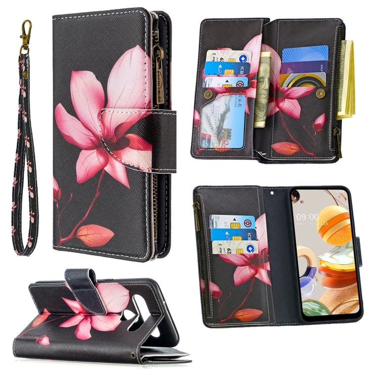 Funda de Cuero para LG K61 con Patrón de Colores, Tapa Horizontal, Soporte, Ranuras y Billetera (Lotus)