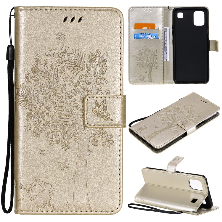 Funda de Cuero PU para LG K92 5G con Patrón Árbol y Gato, Flip Horizontal, Soporte, Tarjetero, Billetera y Cordón (Oro)