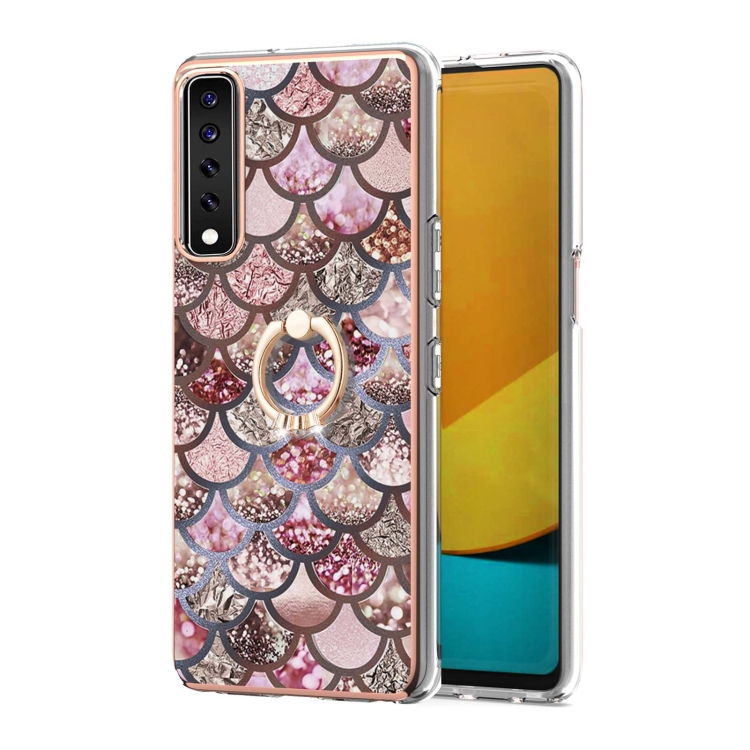 Funda TPU LG Stylo 7 4G con Patrón de Galvanoplastia, Soporte de Anillo y Diamantes (Escamas Rosas)