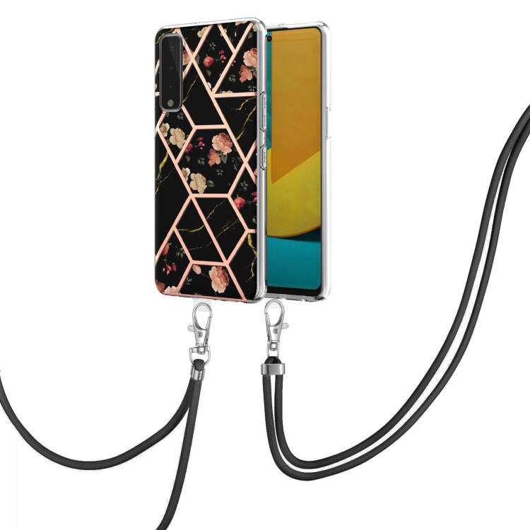 Funda TPU para LG Stylo 7 5G con Patrón Flores Mármol Electrochaplating y Cordón (Negra)
