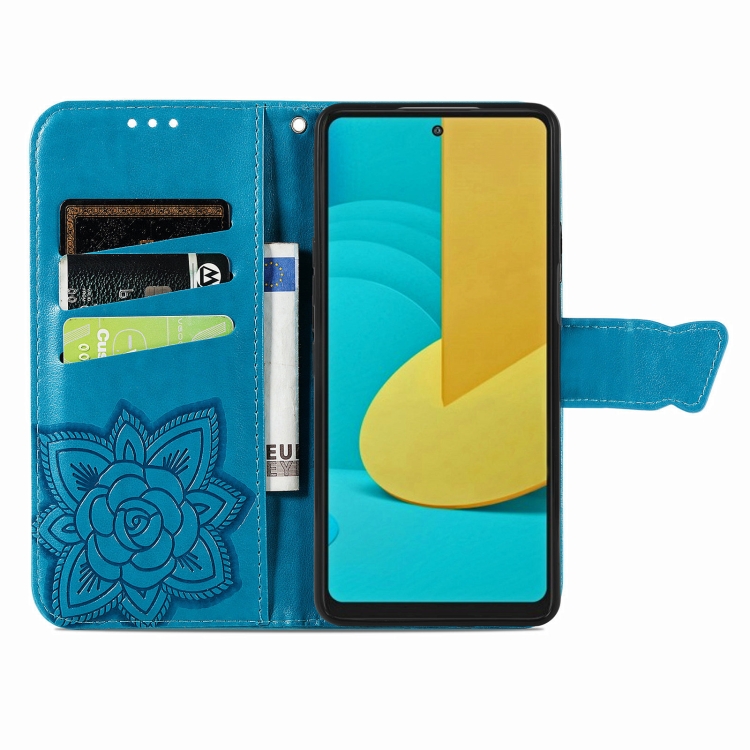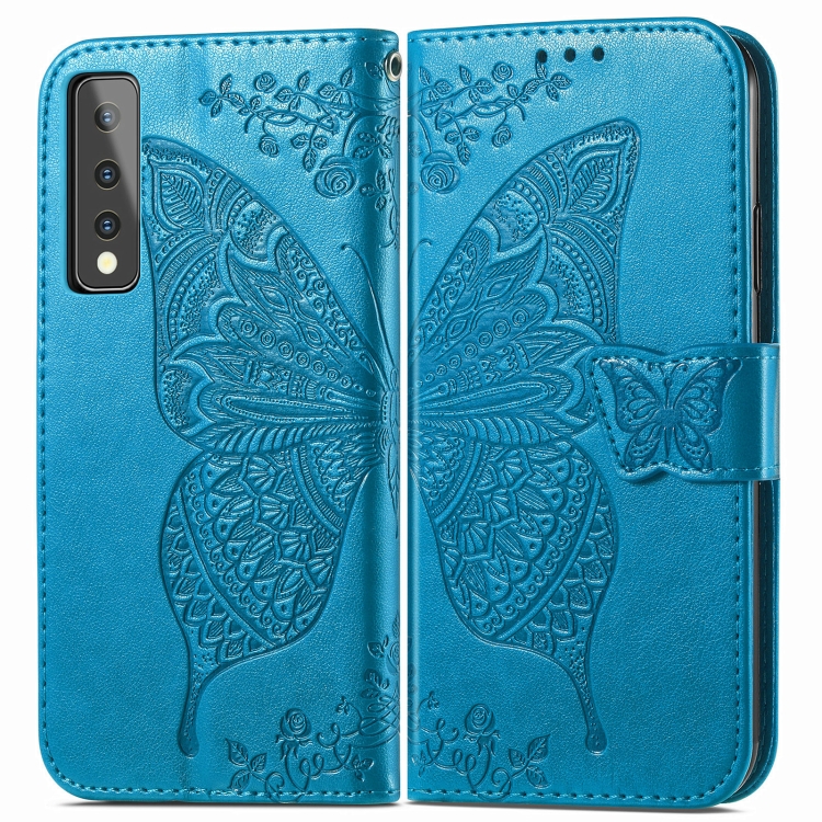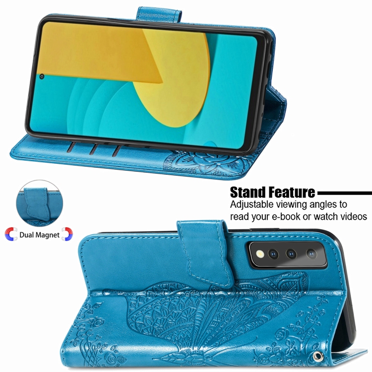 Funda de Cuero Horizontal Flip para LG Stylo 7 Butterfly Love Flowe con Soporte, Tarjeta Slot, Wallet y Lanyard (Azul)